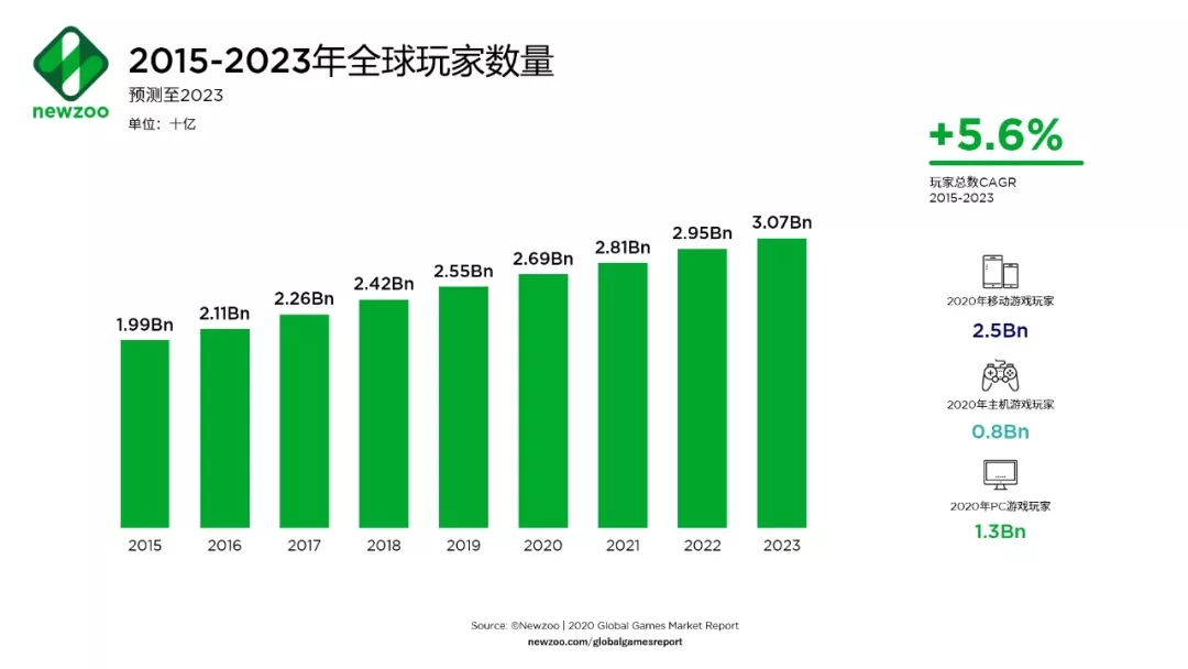 據(jù)Newzoo最新《2020年全球游戲市場報(bào)告》預(yù)測,全球游戲市場規(guī)模將達(dá)到1593億美元,同比增長9.3%;全球游戲玩家數(shù)量將持續(xù)增長,到2023年將超過30億。